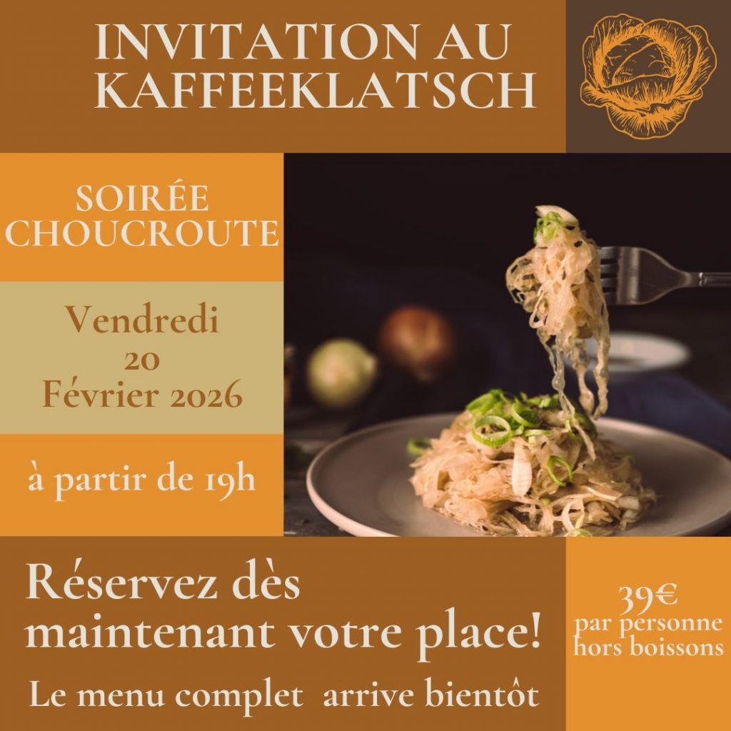 Le vendredi 20 février 2026, nous vous invitons à découvrir une cuisine authentique et réconfortante autour de notre plat phare : la choucroute garnie du K à la bière locale. Un festin généreux de choux fondant, de saucisses, de lard et autres délices en bocaux, parfait pour un moment de partage !Rejoignez-nous pour une soirée riche en saveurs, en bonne humeur et en traditions. Réservez vite votre table !